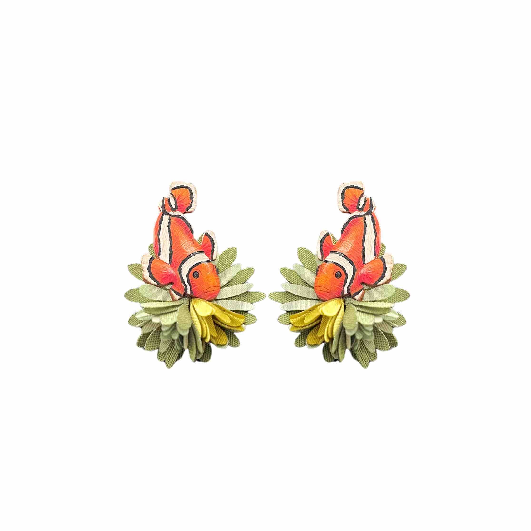 Combined with natural fabric layers, the Clown Fish earrings create a bold yet refined look, transforming plant-based materials into wearable art.